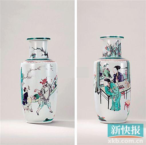 “清康熙 五彩人物故事纹棒槌瓶”2011年在北京保利以126万元成交。所谓“青花则取其沈静。五彩则喜其豪宕。”《陶雅》评点康熙五彩更以“奇诡”二字形容,与此器吻合。此康熙棒槌瓶所绘为月下人物听曲,一人击板,一人持戟表演,神情动作均极“豪宕”,旁有夫妻二人赏戏,果馔罗列,美酒佳肴,然乐而忘食,神情专注,故曰康熙五彩“所画人物,每诙诡可怖,怪怪奇奇,千态万状,余不谙戏曲,不能名其妙”。康熙五彩之妙,有待方家细细品味。