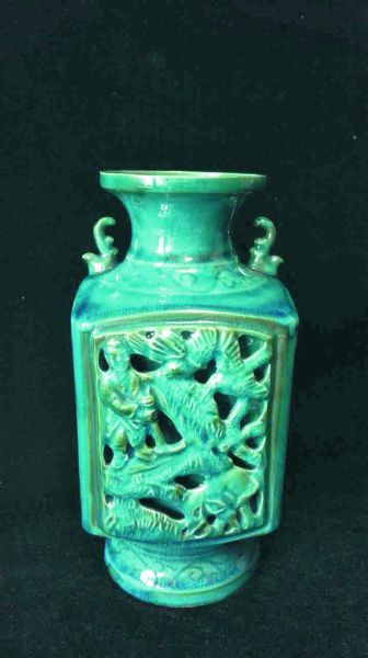 这件器物的尊口、圈足为圆形,肩上鸟型双系,器身近长方形,镂空雕人物、树木、鸟禽。对映有阳纹诗句:“舍侧甘泉出,一朝双鲤鱼。子能事其母,妇更孝其姑。队队春耕象,纷纷耘草禽。嗣尧登宝位,孝感动天心”。釉面为玻璃釉,开细纹片。釉层薄而亮,上手光滑,莹润如玉。胎有杂质,薄而不透。胎质密度不够,断茬疏松,近似香灰胎,外表呈土黄色,介于陶与瓷之间。器底部有绿色斑块,深浅不一,有层次变化。工艺特点为模制成型,分段拼接,凸凹明显,立体感强。