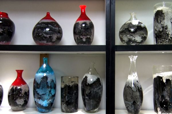 叶建新教授通过与人立琉璃中心的徐月柱先生多次的创作研究,最终成功将自己的水墨画融入1400度高温中的琉璃艺术创作中,把中国传统水墨文化与传统的琉璃艺术相结合,在炉火中把原材料如浓墨重彩一样渲染在琉璃器上,淋漓尽致的展现出各种不同的画面。