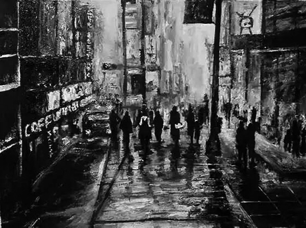 在读田迎人的黑白油画《圣保罗之夜》时,你的手里必须捧着一盏刚煮好的咖啡,就像面对一位凹凸有致的咖啡色的美人一样,你要坐下来慢慢地端详,慢慢地品味。当然,越是细品越有奇妙的味道。作为巴西和整个南半球最大的城市,圣保罗正是闻着咖啡豆的香味长大的。