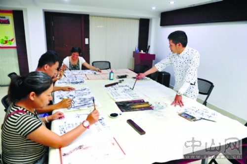 昨日上午,记者在石岐区莲兴社区居委会2楼看到,一群四五十岁的大妈大婶们手执毛笔在平铺开的宣纸上涂涂画画,乐在其中。