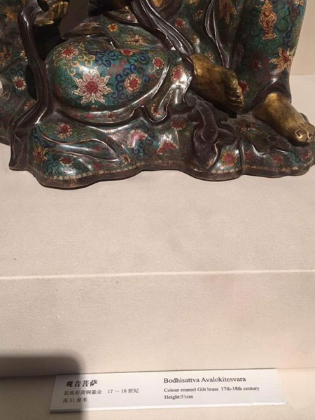 [浙江美术馆展览中标注17-18世纪珐琅彩黄铜鎏金观音菩萨像。民国以前的工匠师都是师傅带徒弟式的传帮带,有非常严格的长期训练后方可出徒。瞧瞧造像的胳膊与手,要在古代这工匠得挨师傅多少耳刮子或另谋生路了]