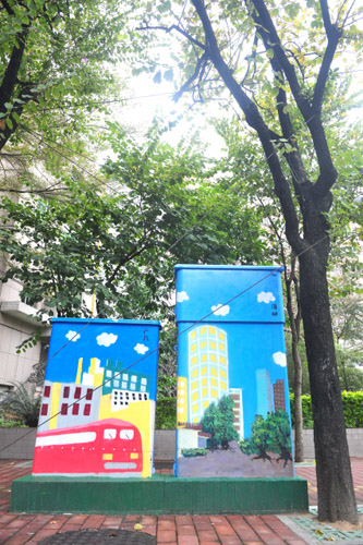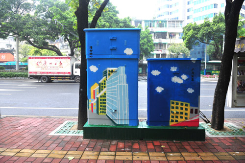 除了垃圾桶点,电箱也来了大变身。在白云街,电箱都能成为“街景”。针对电箱(交接箱)面积较大的特点,街道请广州美术学院学生在上面创作油画。这些油画设计巧妙,构图充分保留了原业主单位的电话、注意事项等信息,还结合了白云街当地的历史文化元素。如白云路曾是1911年建成的广九铁路火车站的所在地,鲁迅先生也曾在白云路上的白云楼居住,因此白云路上电箱的油画就以火车、鲁迅和蓝天白云为主题。
