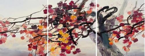 如在本次画展中深受好评的《合柿图》,张大林通过巧妙的纵横取势,通过粗细别致、轻重有序、浓淡相宜、疏密结合、聚散自然、收放明快、刚柔并济的线条色块来构物写形。构图截取景物中最夺目吸睛的部分:丰厚圆硕、形如如意的果实累累,遒劲扎实的枝蔓繁茂跃然画布之上。《尔雅》中蕴含七德的柿树,在他抑扬往复的笔势色彩之中尽露其形其理,冷暖相合之处郁勃之形迎面,色彩动人之间自由情态盎然而生。既有画家本身创作的灵感带来的独特魅力,又暗合了当下宽松、开放的审美心理趋势,具有鲜明的个人和时代艺术气息。对此,有现场观展者表示,整体来看,张大林的这些柿树和松柏为主题的画作很有风格和气势,而且不同于的以往美术界中的西方艺术主体形象,从里面能明显感觉到“这些画的根基在中国”。