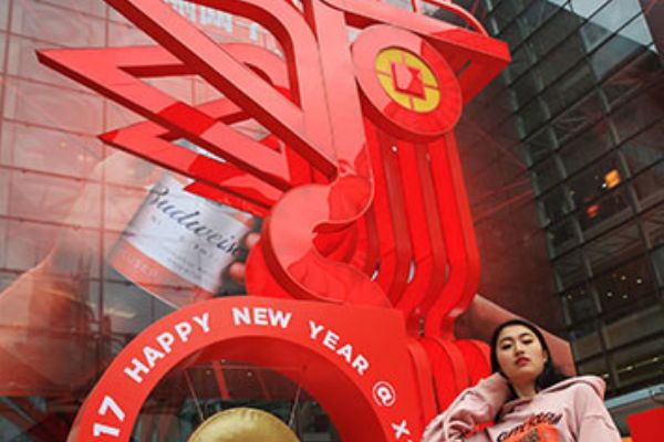 1月10日,一座10米高的“声东鸡西”新春艺术装置亮相上海新天地,吸引游客和时尚人士驻足观赏。
