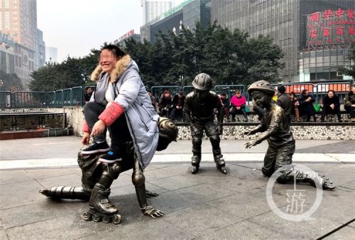 上游新闻-重庆晨报记者采访时,雕塑中间,一位中年大姐正怡然自得坐在雕塑上玩手机。被坐的,是一个摔倒男孩的雕塑,那对比强烈的画面,看着叫人心疼,雕塑中的男孩仿佛在说:“孃孃,你太重!我受不了了……” 旁边就有为市民准备的座位,大姐为啥坐在雕塑上?而大姐似乎并不以为然:“这雕塑坐得坏吗?”而孩童腿部,则坐着大姐的家人。
