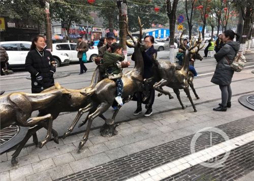 而一旁,城市雕塑被当成了靠背、衣架、木马……一位头发花白的大叔直接把轮滑孩童的手臂,当成了靠背;有大妈将孩子的外套“晾”在雕塑的肩膀上。不远处一组“群鹿狂奔”的雕塑,因为经常被当成“木马”,梅花鹿背部已经被磨蹭得发亮……