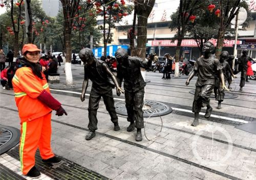 负责南坪广场保洁的清洁工熊大姐也是一幅心疼的样子。“以前,娃娃们面前是一排亮铮铮的铁环,每一个娃娃滚一个铁环,好漂亮!但现在,好多人不晓得这雕塑是啥意思!”