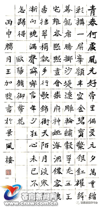 王加煦,又名王宏瑜,斋号景风楼、和斋。温州市书协理事,苍南县书协副主席,师从中国文联副主席、中国书法家协会副主席陈振濂教授。2010年参加“草圣追踪“大草研究班,专攻大草技法;现为颐斋书院“楷法表现”班成员。2013年参加镌墨楼魏碑讲习班,分别经历摩崖、墓志和碑榜等魏碑书法训练。书法作品先后荣获“陆维钊奖”浙江省第七届中青年书法篆刻展铜奖,浙江省第三、四届群星视觉艺术大展银奖等。