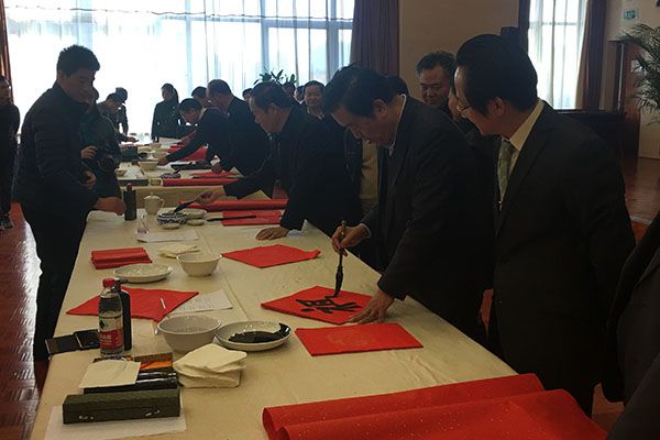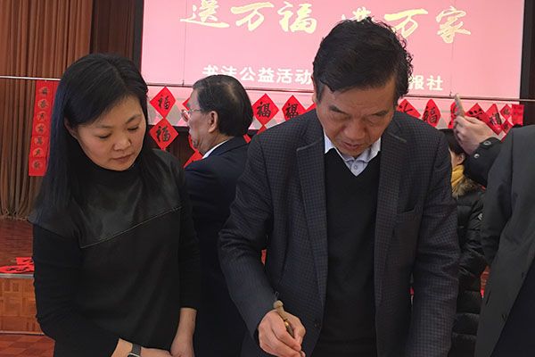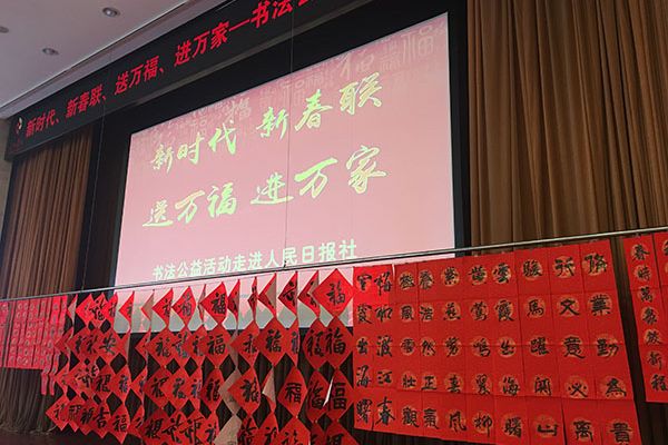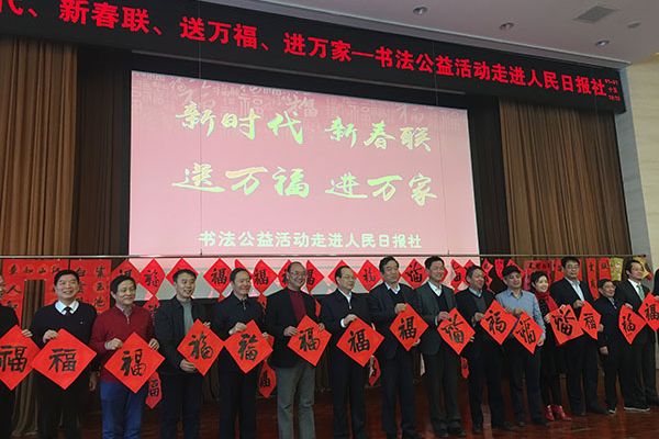 书香含雅意,春联送祝福。1月31日上午,在新春佳节即将来临之际,由中国书法家协会、人民日报社神州书画院共同主办的“新时代、新春联、送万福、进万家”书法公益活动走进人民日报社,由全国政协常委、中国书法家协会主席苏士澍带队的书法家们与长年奋战在新闻战线的党中央机关报编辑记者们欢聚一堂,现场挥毫泼墨,为人民日报社职工赠送各种书体书写的春联和福字,献上新春美好祝福。 人民日报社社长杨振武,人民日报社秘书长乔永清,中国书协理事、人民日报社文艺部主任梁永琳,人民网总编辑余清楚,人民日报社神州书画院院长刘君慧,全国政协常委、中国书法家协会主席苏士澍,中央国家机关书协副主席、民政部原常务副部长罗平飞,中央国家机关书协常务副主席、审计署外事司原司长罗美富,中央国家机关书协副主席、中国人民对外友协原党组成员兼秘书长罗勤,中央国家机关书协副主席、公安部消防局原政委、少将谢模乾,中央国家机关书协副主席、解放军审计署原副审计长、少将赵天民,中央国家机关书协副主席、中书协原理事朱守道,中央国家机关书协主席团成员兼副秘书长、建材出版社社长秦春雨,与现场近百名人民日报书画爱好者及员工一同参加本次活动。 乔永清对苏士澍一行表示热烈欢迎,他说,人民日报始终坚持党的文艺方向,特别重视文艺宣传包括书法宣传工作,有文艺部、神州书画院等专业的文艺部门和单位,更有大批的书法爱好者。这次活动不仅丰富了报社的文艺生活,也将给报社的文艺宣传以及文艺活动带来极富现实意义的指导和促进。今年适逢人民日报社神州书画院创办30周年。30年来,神州书画院一直与书画界保持良好的关系,也得到书画界朋友们的支持与帮助。“我相信,通过这次活动,我们的艺术交流将会更加活跃,我们之间的理解和感情将进一步加深。” 苏士澍在致辞中表示,习总书记指出:“中华优秀传统文化是中华民族的基因和精神命脉,是涵养社会主义核心价值观的重要源泉,也是我们在世界文化激荡中站稳脚跟的坚实根基。”中国书法是五千年来中华优秀传统文化中最具代表性的民族符号,是我们优秀传统文化的瑰宝。写春联、贴福字是中华民族悠久的年俗和优秀的文化传统,不仅能营造喜庆、祥和的节日氛围,还寄托了人们对新年的期待、对美好生活的向往,也必将引领新时代的新气象、新风尚。中国书法家协会将与神州书画院一道,团结引领广大书法工作者共同肩负起新时代赋予的新使命,认真贯彻党的文艺路线、方针、政策,坚持以人民为中心的创作导向,不断深入生活、扎根人民,到人民中去,为人民创作,抒写新时代、凝聚正能量,为培育和弘扬中华优秀传统文化、建设社会主义文化强国作出新的贡献。 据悉,“新时代、新春联、送万福、进万家”书法公益系列活动由中华全国总工会、中央电视台、中国书法家协会共同发起,自今年1月15日启动以来,先后走进公共外交协会、外交部机关、中国航空工业集团、中国航天科技集团、团结湖地铁站、人民日报社等单位,累计为各界群众送出33万份统一印制的具有新时代气息的春联和“福”字,还通过外交部向中国驻外使领馆和外国驻华使馆寄出1万份春联,获得了广泛好评。 活动现场书法家在挥毫 苏士澍先生在现场挥毫 活动现场书法家书写的“福”字
