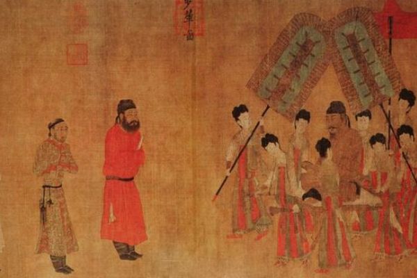 本次展览的一件重量级展品——唐代画家阎立本所绘的《步辇图》,为兽首胡人纹银壶反映的历史价值提供了更多印证。《步辇图》描述了吐蕃禄东赞受松赞干布派遣,向唐太宗请求和亲的史实。画中禄东赞身穿的长袍疑是四川产的仿萨珊、栗特样式,参考《步辇图》上的服装样式便可得知,银瓶上的人物服装在吐蕃王朝时期已经流行。《步辇图》作为中国十大传世画作之一,具有珍贵的历史价值,见证了松赞干布时期唐蕃使者互访的频繁程度。《布画禄东赞请婚图唐卡》《布画金成公主进藏图唐卡》等文物也是唐蕃友好和平往来的有力证明。