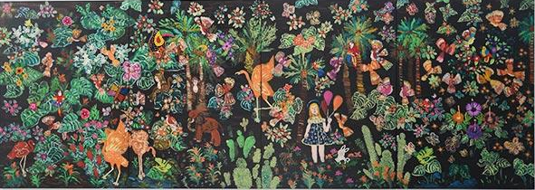 莎莉1990年生于巴拿马,2016年中央美院壁画系本科毕业,现为中央美院壁画系研究生。她的作品描述有很多:体现本能、自然的唤醒、天然的长成等等。这次展览的主题“童”也是对新近创作的《雨林之歌》、《动物世界》系列作品解读的另一种定义,是童心,是童趣,也是童真……恰到好处。