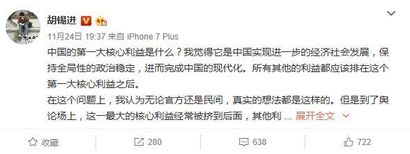 24日,环球时报总编辑胡锡进发长微博谈论“中国的第一大核心利益是什么”。以下是胡锡进长微博原文:中国的第一大核心利益是什么?我觉得它是中国实现进一步的经济社会发展,保持全局性的政治稳定,进而完成中国的现代化。所有其他的利益都应该排在这个第一大核心利益之后。