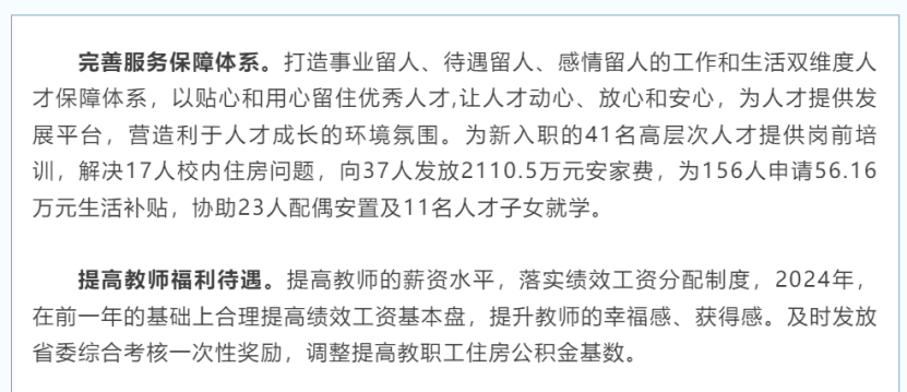 据淮南师范学院近日消息,该校明确表示提高教师的薪资水平,落实绩效工资分配制度,2024年,在前一年的基础上合理提高绩效工资基本盘,提升教师的幸福感、获得感。及时发放省委综合考核一次性奖励,调整提高教职工住房公积金基数。