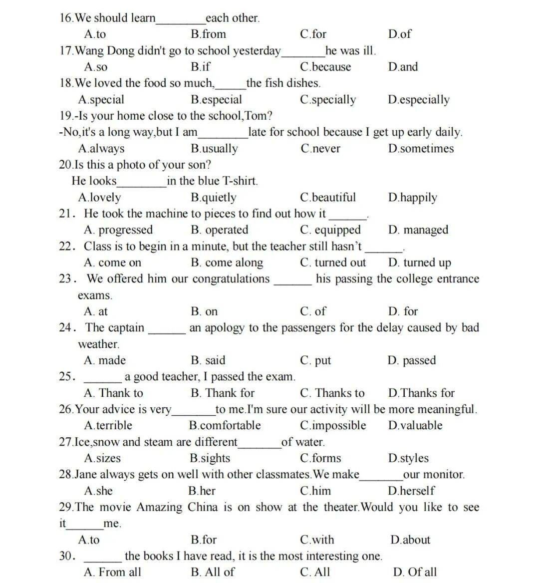 单项选择题:如 “Eleanor Roosevelt was the wife of America′s 32nd president,Franklin Roosevelt.She helped her husband in many ways during his long( )life.”,需从选项中选择合适的词汇填空。还会考查短语搭配、句型结构、时态等内容,也有一些关于短文阅读的选择题,根据短文内容选择正确答案。