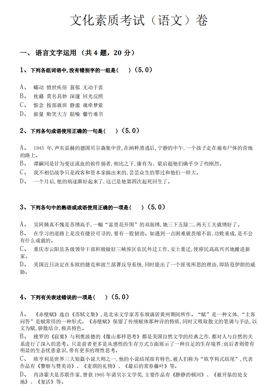 语文:注重考查文学常识和阅读理解能力等。