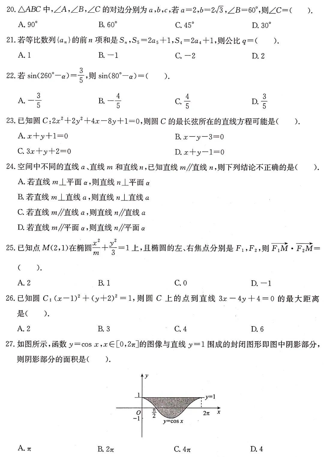 单项选择题:例如 “在点 x=0 处的导数等于零的函数是( )A.y=sinx B.y=x-1 C.y=ex-x D.y=x2-x”,答案是 C。还有集合运算、三角形形状判断、函数奇偶性判断等题目。