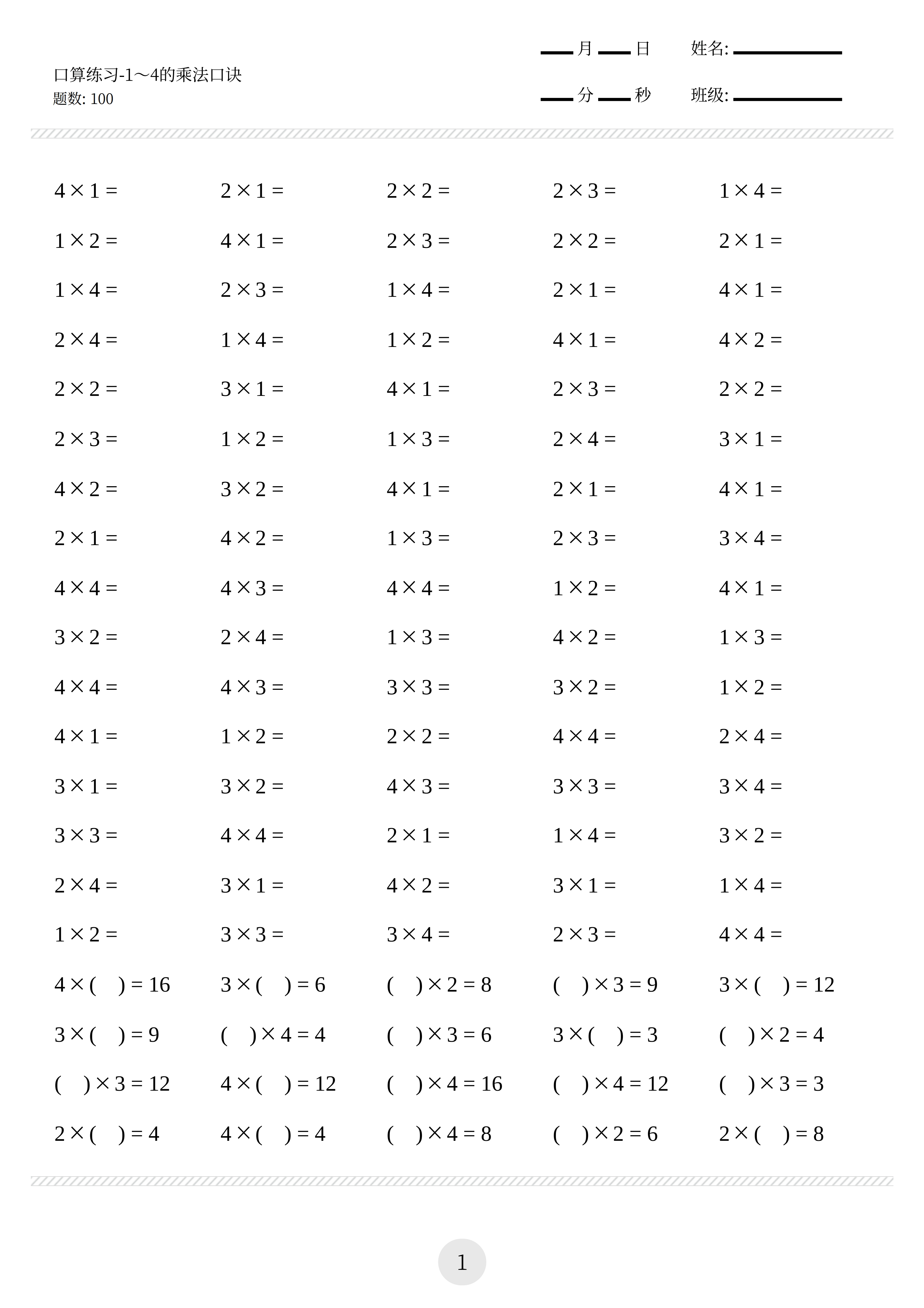 从 1 - 4 的乘法口诀练习开始,这些基础的乘法运算能让孩子逐步熟悉乘法的意义与运算规则。像 “2×3 = 6”“4×1 = 4” 这类简单的乘法算式,通过反复练习,孩子可以快速牢记,为后续学习更高难度的乘法口诀奠定基础。
