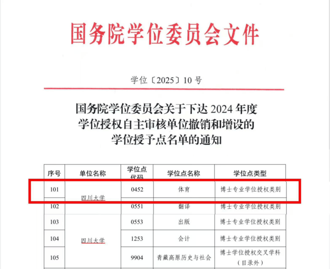 四川大学自主审核增设的体育、翻译、出版、会计博士专业学位授予点正式获得批准,同时获批青藏高原历史与社会博士学位授权交叉学科(目录外)。