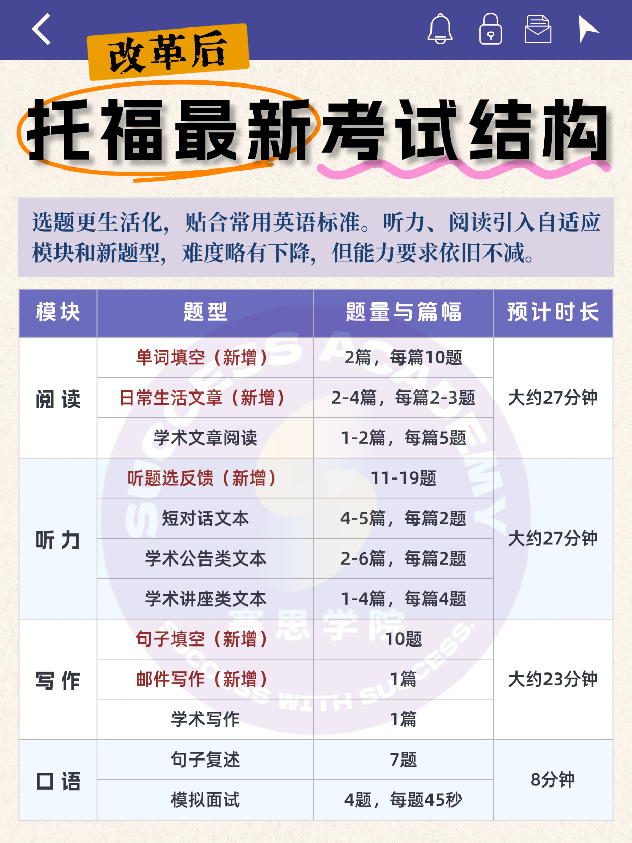 新版TOEFL iBT将从2026年1月26日开始实施,下面随ss老师一起来看看改革后都有哪些变化吧~