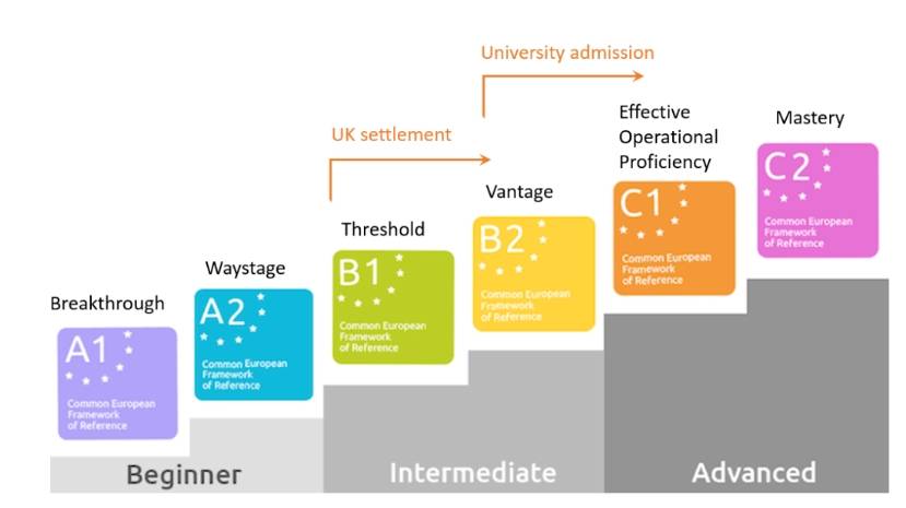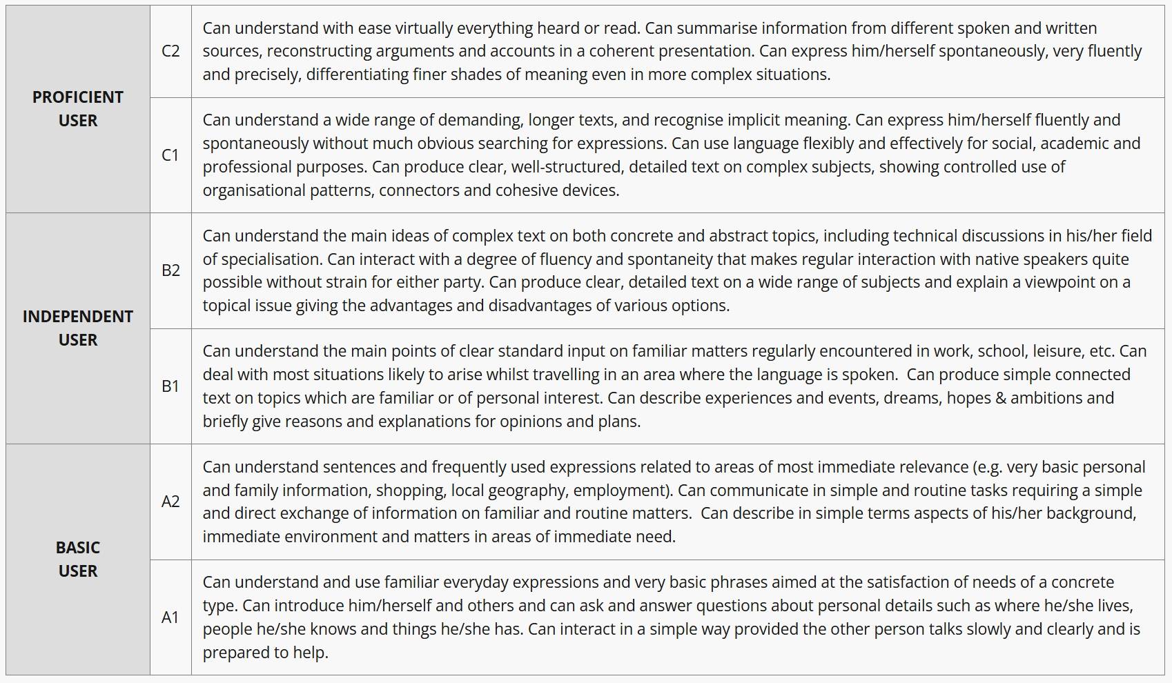 CEFR把语言能力由低到高分为A、B、C三个等级,每个等级都分为2个级别,分别是:A1、A2、B1、B2、C1和C2,每一个级别都给予相应的语言能力描述,国际生的英语水平通常都是要达到CEFR B2水平及以上才可以。