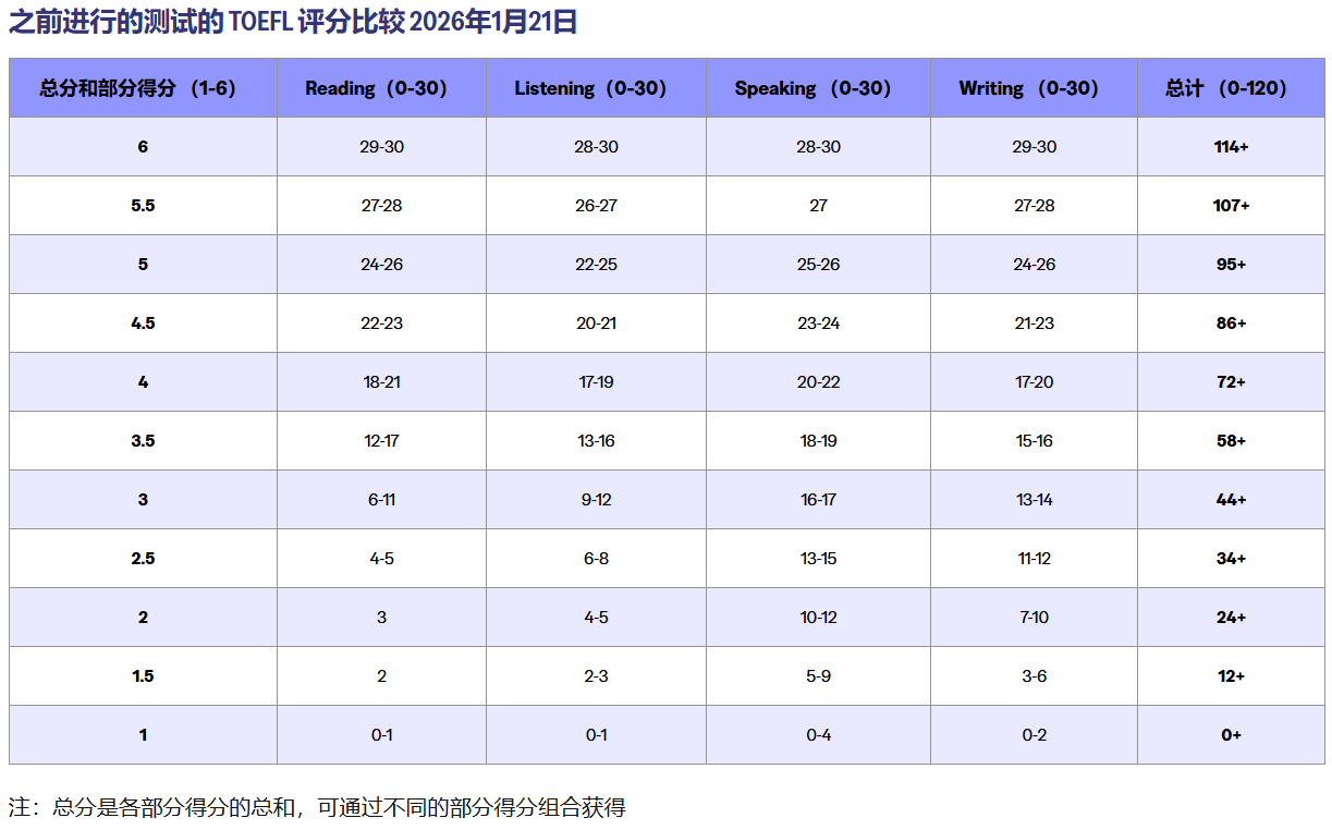 以往托福采用0-120分制,但不同国家、不同院校对分数的解读标准是有区别的,难免需要反复换算,所以2026年托福的评分标准将正式改为【传统120分制 ➕ 1-6分评级制】的双轨制,对标CEFR欧洲语言标准,同时,成绩单还会新增评级描述和分数说明,直接定位目前能力水平的优势和不足,更方面大家针对性提升和申请。