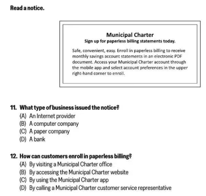 选自海报、邮件、菜单、通知、收据等短文本,从中提炼关键信息回答问题,比如给你一则校园活动的通知,从中寻找报名时间等等,考查非正式语境理解。