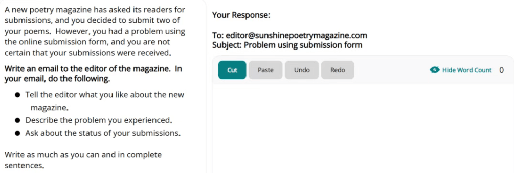 限制7分钟,根据题目要求撰写课程建议信、活动咨询信等邮件,考察邮件的格式规范、语体适切性和问题解决逻辑。