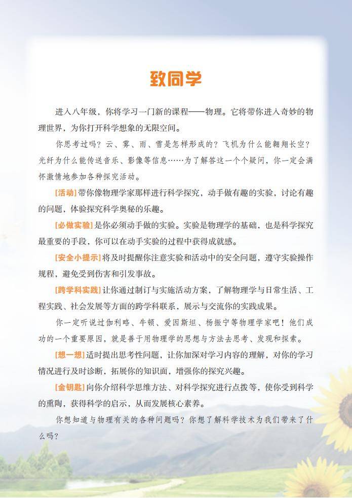这本教材从基础物理知识到实践应用,全面引导八年级学生学习物理。学生借助教材,能扎实掌握物理概念与规律,提升科学素养,学会用物理知识解释生活现象、解决实际问题,逐步培养对物理学科的兴趣与探索精神,助力物理学习稳步推进。