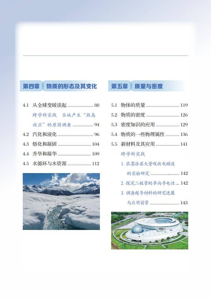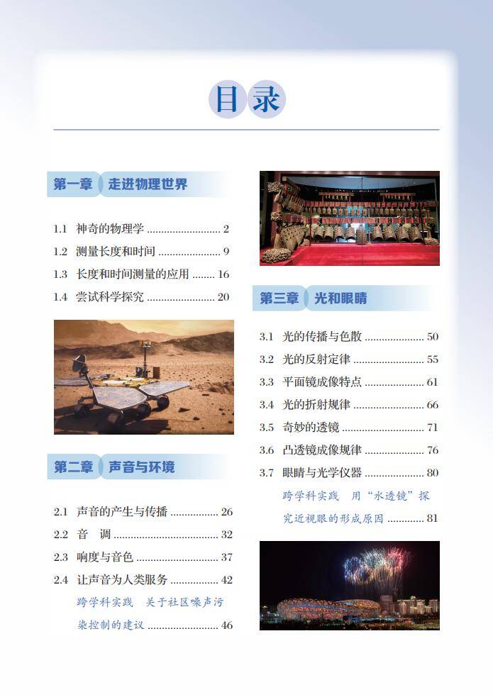 内容涵盖走进物理世界(包括神奇的物理学、测量长度和时间等)、声音与环境、光和眼睛、物质的形态及其变化、质量与密度等板块,还有跨学科实践、自我评价与作业、课外活动等学习活动。对于学生学习,能帮助开启物理学习的大门,系统学习物理基础知识,通过实验、探究等活动,培养科学思维、探究能力和科学态度,让学生了解物理与生活、社会的联系,为后续物理学习奠定基础。