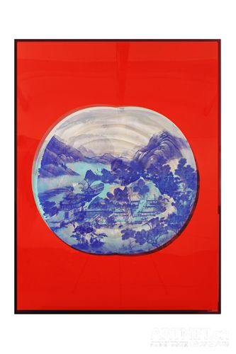 原弓的作品《圆明园》系列是结合装置、影像、行为、绘画、丝网版与印刷术等综合媒介跨界而成的作品,主要基调为“中国红”,在红色的背景下,传统中国山水画、圆明园兽首等图式“隐约”呈现。作品的制作过程很有深意:艺术家约花费一个月时间将山水绘于铁皮之上,然后用机械的方式将绘画打磨,破坏、消解完整的图画,最后将错版丝网版画覆盖在上面。
