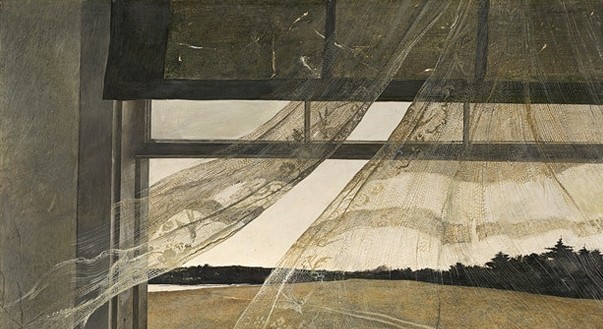 怀斯的窗景作品中运用了巧妙的构图技法,有一种迷惑人心的真实感。他最负盛名的一幅作品为《来自海边的微风》,在这幅作品中来自海边的微风将窗帘吹到了开着的窗边。这幅作品是他在美国缅因州的奥尔森故居中创作的。当时他先画了一幅速写,在接下来的几天中他完成了这幅作品。 怀斯回忆那时的情境说道:“ 1947年的那个夏天我在阁楼里觉得烦热干燥,天气太热了,于是我打开了一扇窗。顿时一阵清风拂面而来,吹起了蕾丝制的窗帘,窗帘上的小鸟图案也飞翔了起来。我创作的灵感来源于生活中不怎么被人留意的难忘瞬间。每每遇到这个瞬间我会先画一幅速写稿,然后在接下来几周的时间里做更多的观察然后完成一件作品。”