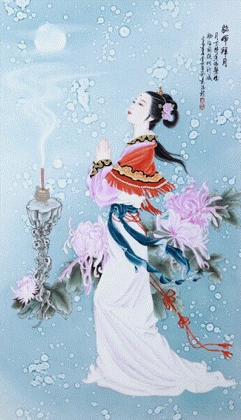 “拜月”是中秋节非常盛行的一个活动。在瓷器作品中也有许多体现,其中最为著名的就是“貂蝉拜月”。传说貂蝉将生人世,三年间当地桃杏花开即凋;貂蝉午夜拜月,月里嫦娥自愧不如,匆匆引入云中。因此,在瓷器传统绘画题材中,貂蝉与月亮往往组合在一起,称之为“貂蝉拜月”。