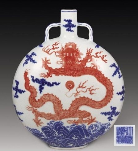 在众多瓷瓶中,有一种瓶因瓶腹似圆月,而命名“抱月瓶”。其外形最早源于宋元时期流行于西夏的陶制马挂瓶,左右双系,用以挂于马鞍之侧,极具民则特色。抱月瓶自身独特的风格将色彩与器形完美融合于一体。是明代永乐、宣德景德镇瓷器常见器物之一。