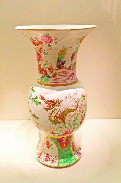从中世纪宗教色彩鲜明的祭坛装饰、圣母子雕像,到20世纪充满先锋意味的招贴画,无不透出浓厚的“洋味”。而展厅中一对“远东风格彩绘描金龙鸟花卉纹尊形瓶”,却带给我们穿越时空的错愕。这对花瓶仿照中国古代青铜尊的样式,白底瓶身以五彩描绘出一条融合西方技法的中国龙形象,龙身腾跃健硕,四周花色繁盛,凤鸟啼鸣,呈现出雍容富贵的东方气息。