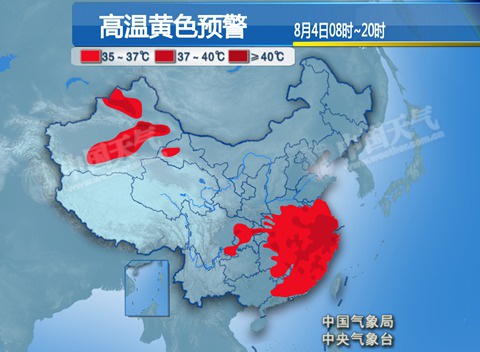 中央气象台预计,未来三天,受副热带高压影响,黄淮南部、江淮、江汉、江南大部、华南东部及四川盆地东部等地将有35℃以上的高温天气,部分地区最高气温37~39℃,期间受冷空气影响,5日开始,四川盆地东部和黄淮南部的高温减弱。另外,新疆南疆盆地、吐鲁番盆地和准噶尔盆地南部等地有35℃以上的高温天气,部分地区最高气温37~39℃,吐鲁番盆地可达40~42℃。为此,中央气象台8月4日06时继续发布高温黄色预警。
