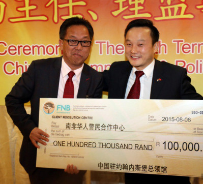8月8日,新一届南非华人警民合作中心(警民中心)理监事会在约翰内斯堡成立,并举行就职典礼。图为中国驻南非的使领馆向警民中心捐款。