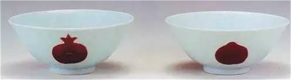 这一对白地釉里红三果纹碗是雍正时期的作品。圈足圆腹,口微侈。碗体为青白色,釉里红呈三果纹,发色纯正,稚拙古朴。为雍正官窑典型器物。上有“大清雍正年制”六字二行楷书款,雍正本朝。高12。2厘米。