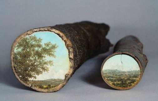 纽约艺术家Alison Moritsugu以木头断面为画布,画下一幅幅如果没有经过工业化的破坏,可能仍能保存至今的美国原始自然风光,除了茂密繁盛的树林,还有以蓝天為背景挺立出各种不挠姿态的枯枝,以及倒映出山水景致的清澈湖水。Alison将这系列作品取名为「inconsequence/ in consequence」(矛盾/后果),用大自然的产物来画出被破坏了的自然,彼此矛盾之餘,又让人意识到在人类经济活动无止境的破坏之后,人们究竟失去了什么,又剩下些什么!
